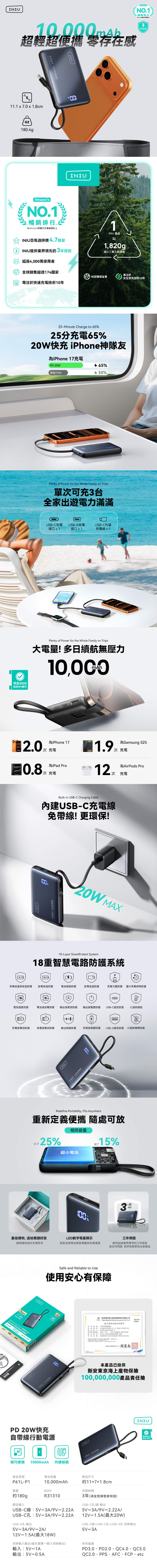 USB-C孔/線 輸出 : 5V-3A/9V-2.22A